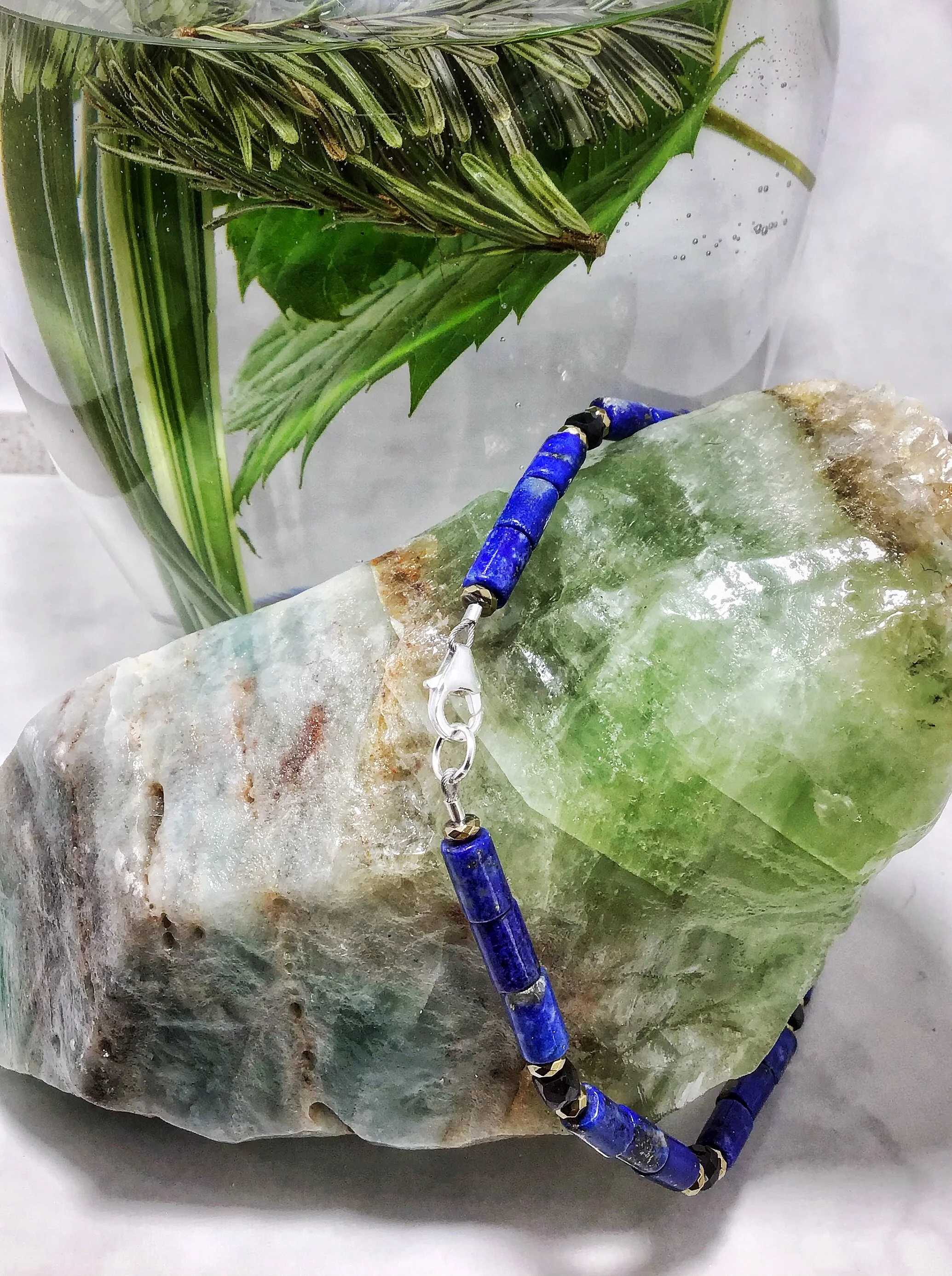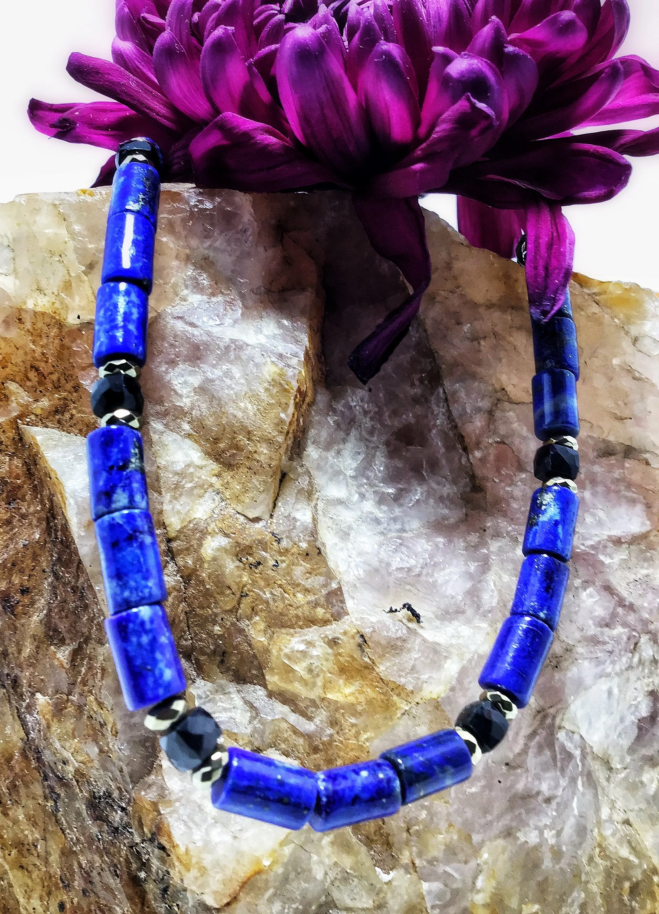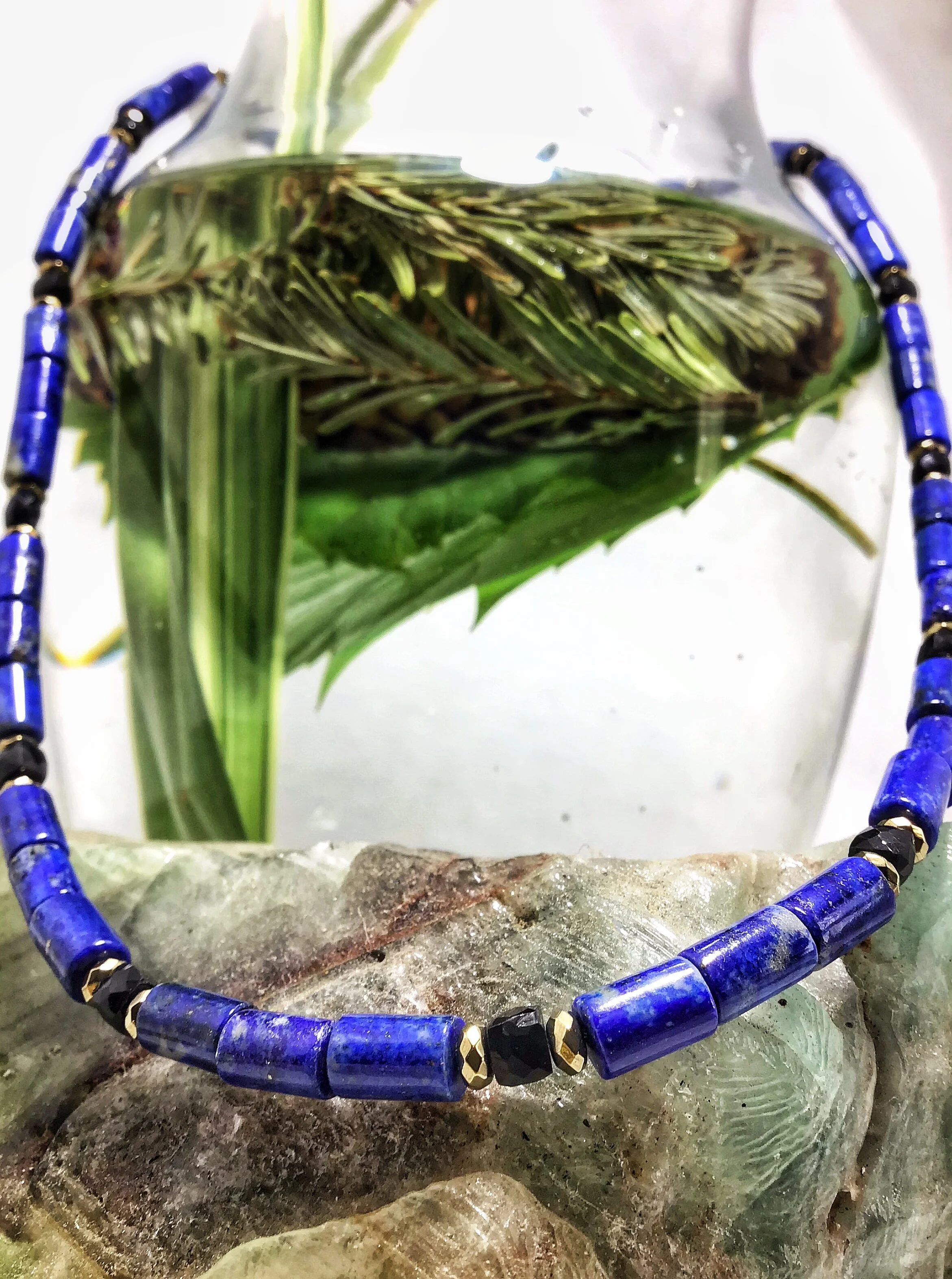Lapis Lazuli Tube Bead Necklace: Accented with Pyrite & Black Spinel