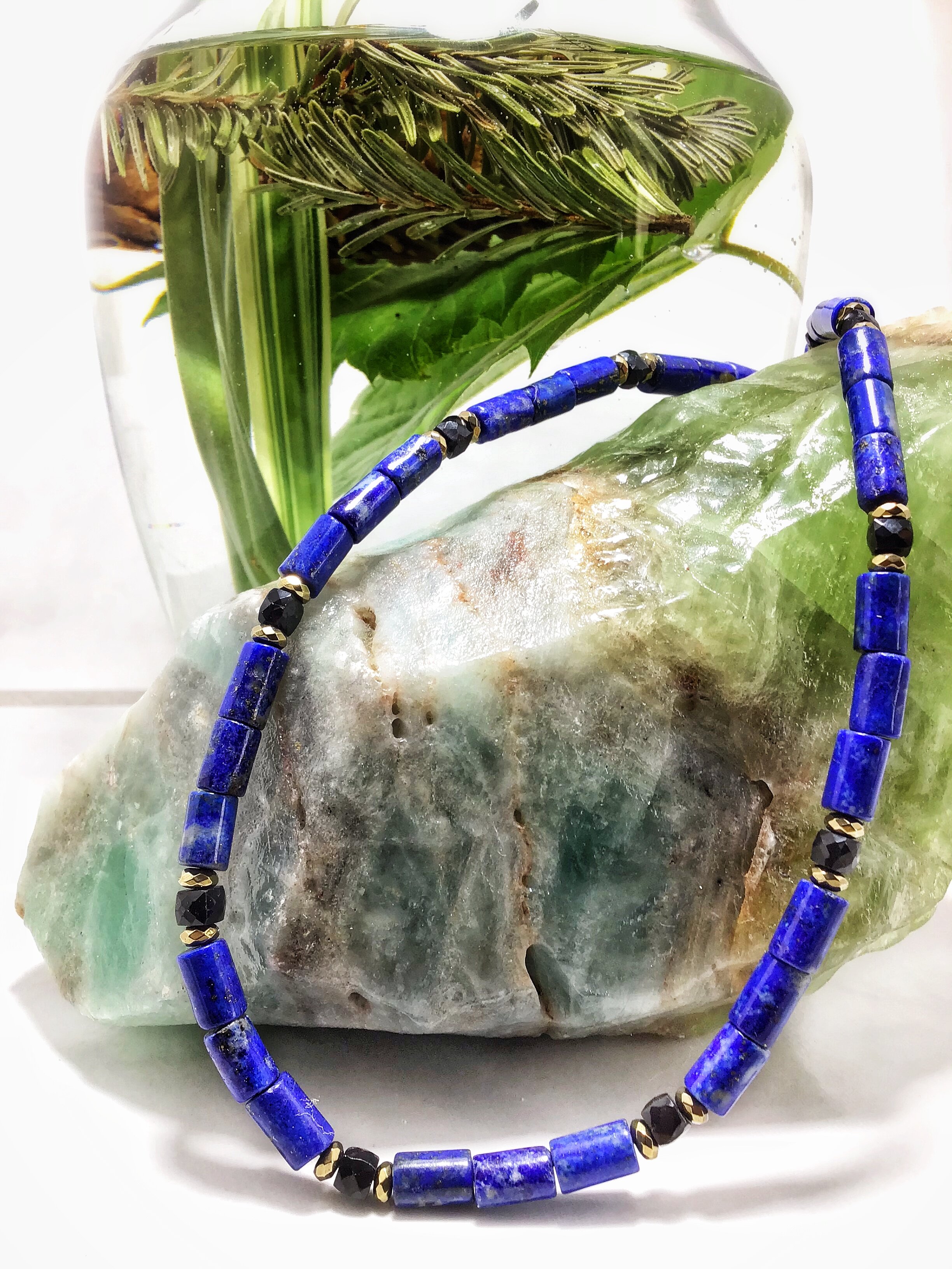What is there to say? It’s lapis and it’s gorgeous. The pyrite beads serve as a wonderful accent to the pyrite that naturally snakes through Lapis Lazuli. The black spinel helps the lapis stand out even more. Black spinel is so shiny it is often mistaken for black diamond, while also being rather rare. Metaphysically it is also known for dispelling negativity and negative energy. So much going on in this piece.