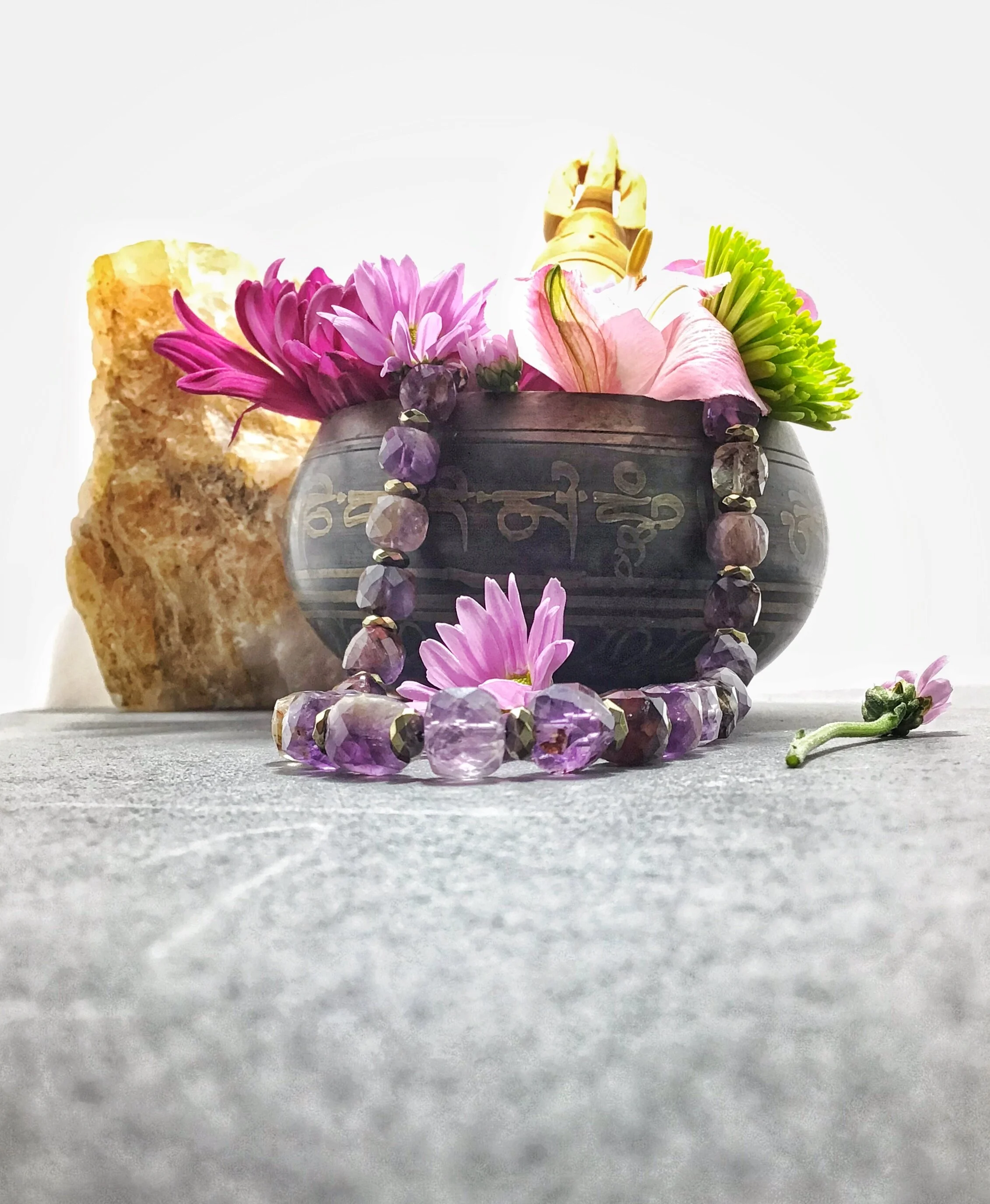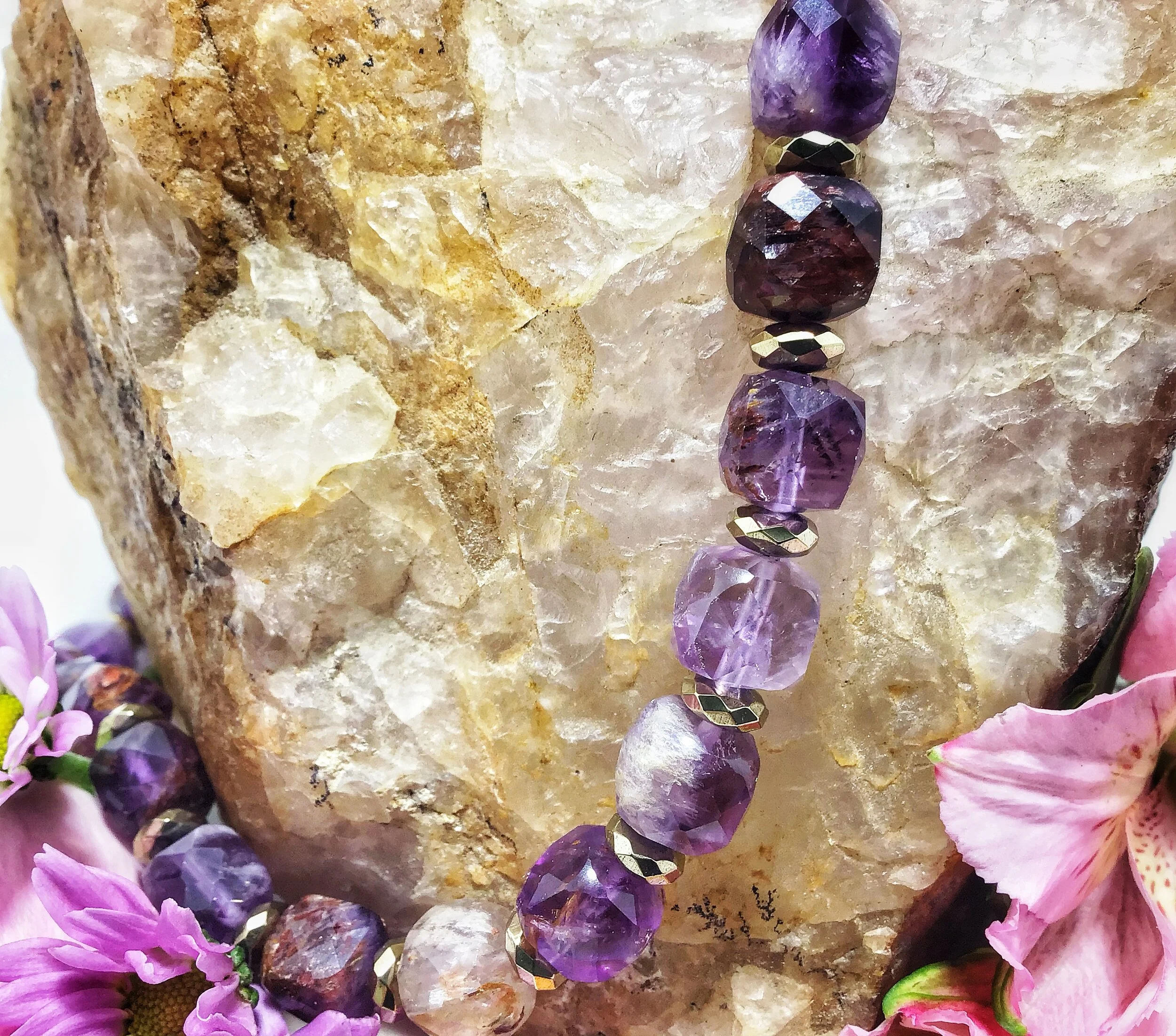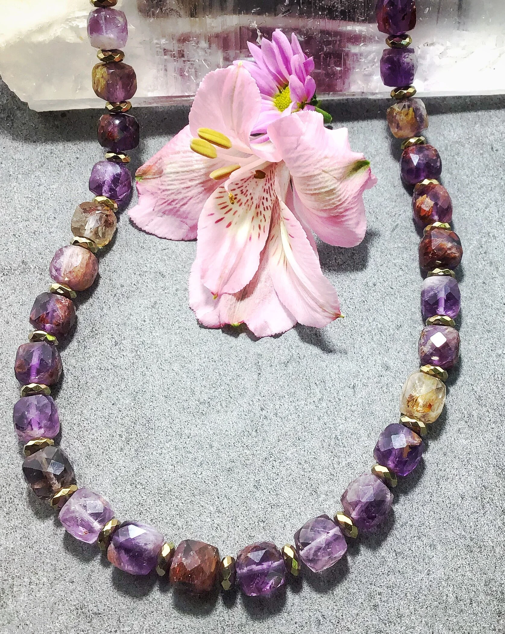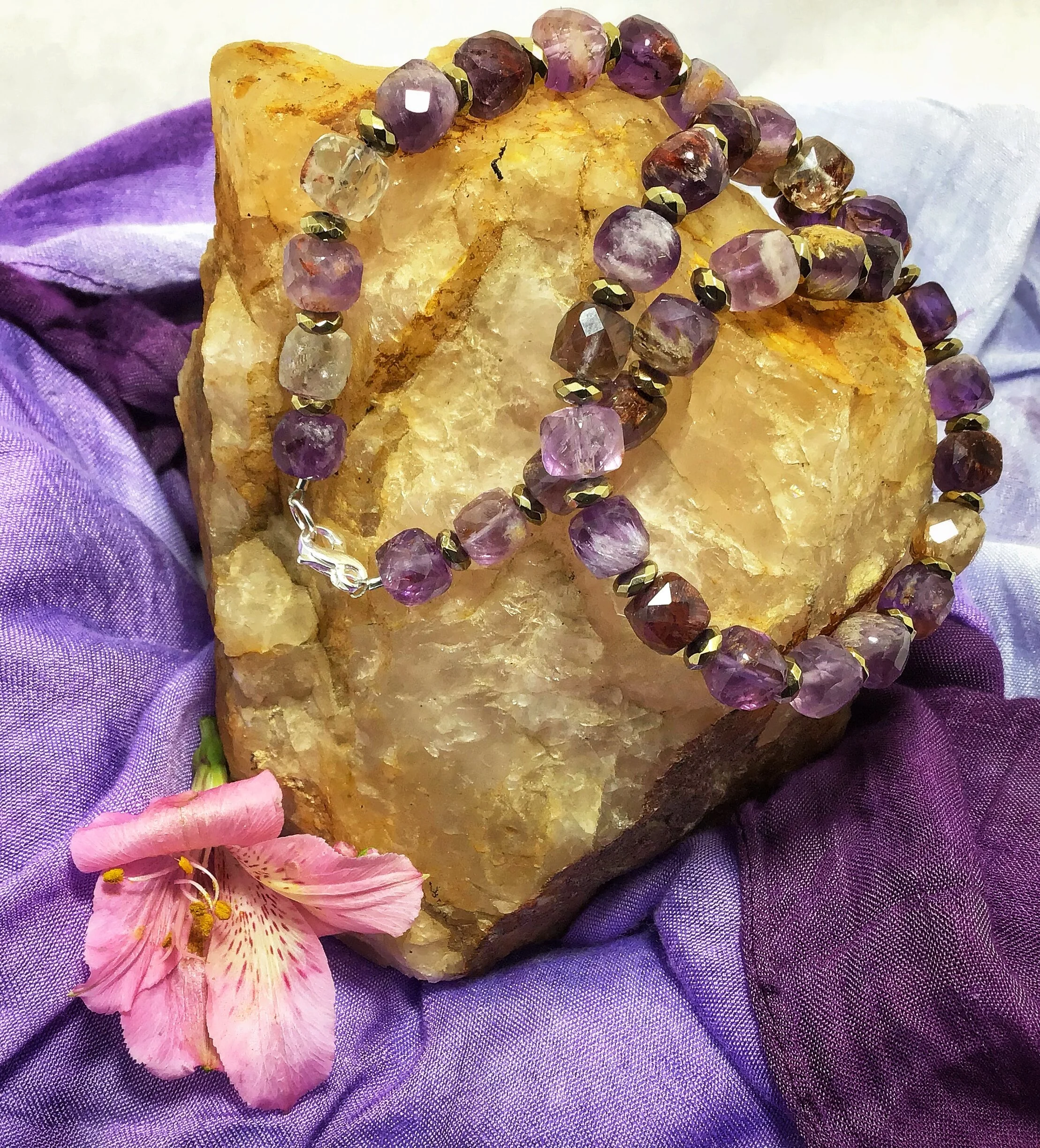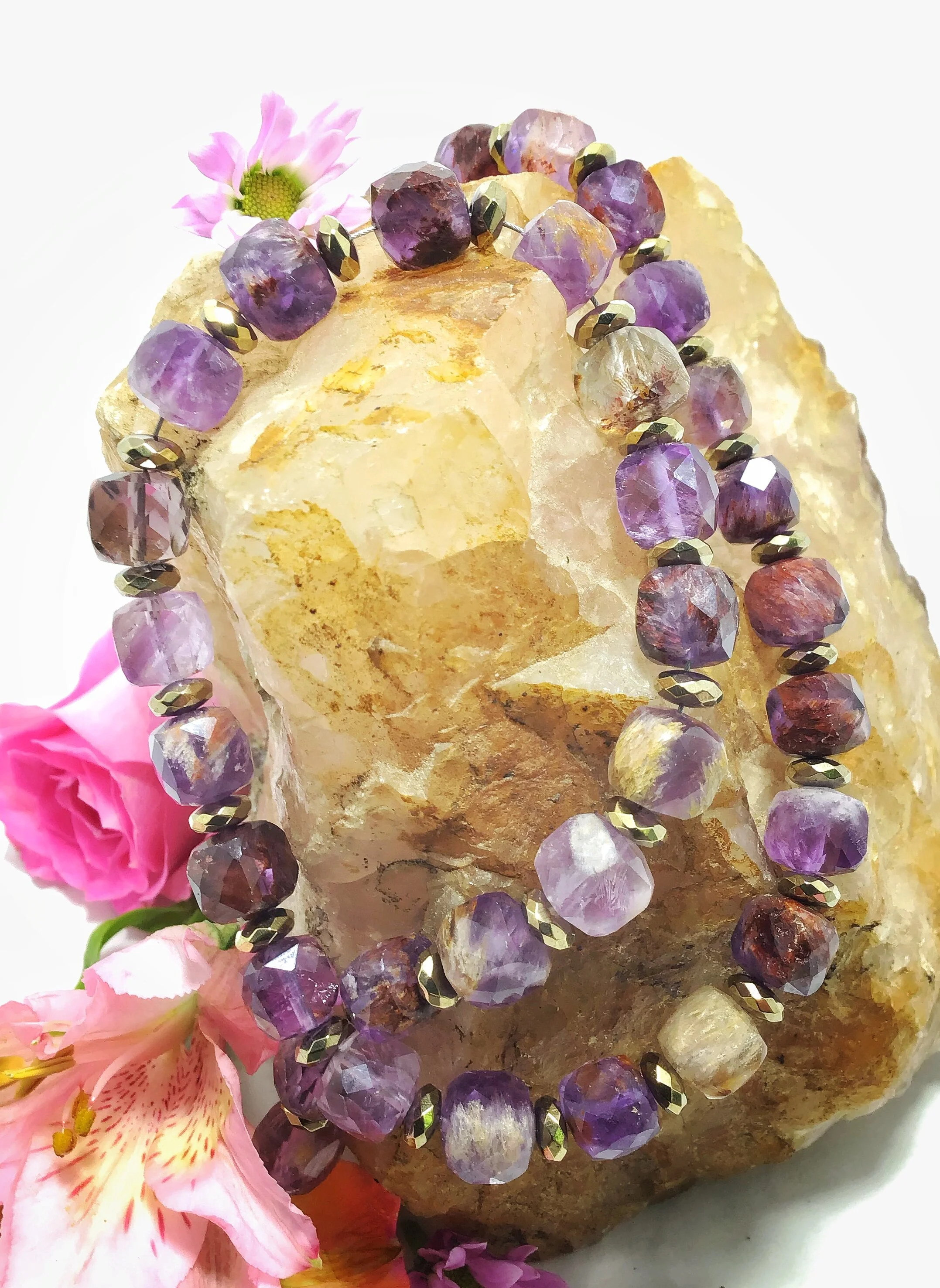 This is a truly magical piece, created with a rare, powerful crystal. Beautiful to behold and healing for the spirit and mind the necklace is made from wonderfully cut and faceted Super Seven crystal, formed into beads. Pyrite spacers in between the beads help each individual crystal bead stand out on its own, yet lends to the whole cohesive beauty of the entire piece. Strung on braided steel wire, and finished with a pure silver clasp, this necklace is made to make mouths drop and continue putting forth its powerful, magical properties throughout a lifetime.